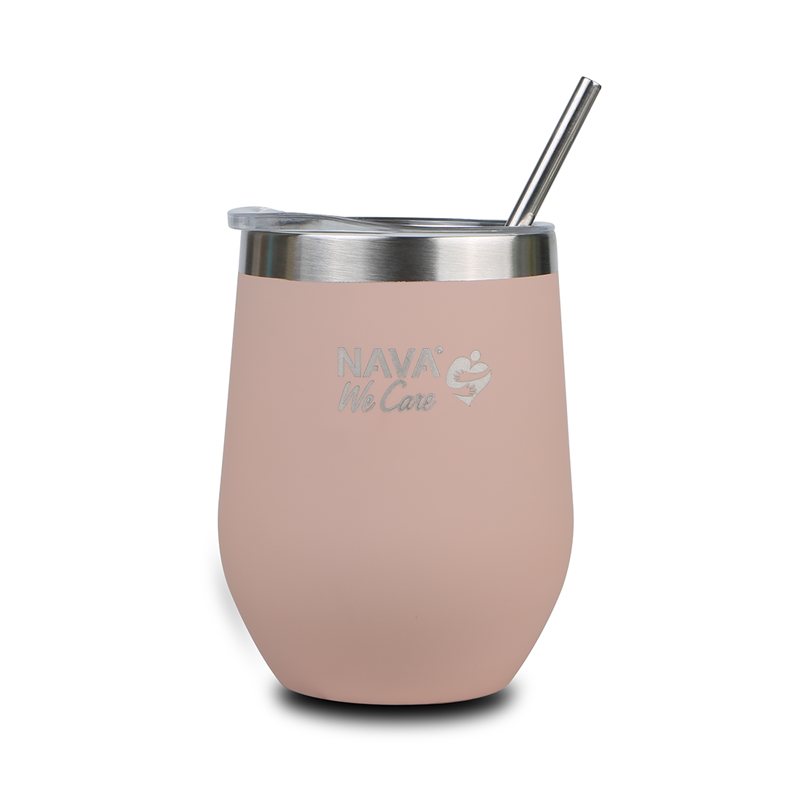Cestovní hrnek NAVA je vysoce kvalitní termohrnek v něžné růžové barvě; kombinuje tak funkčnost se stylem.