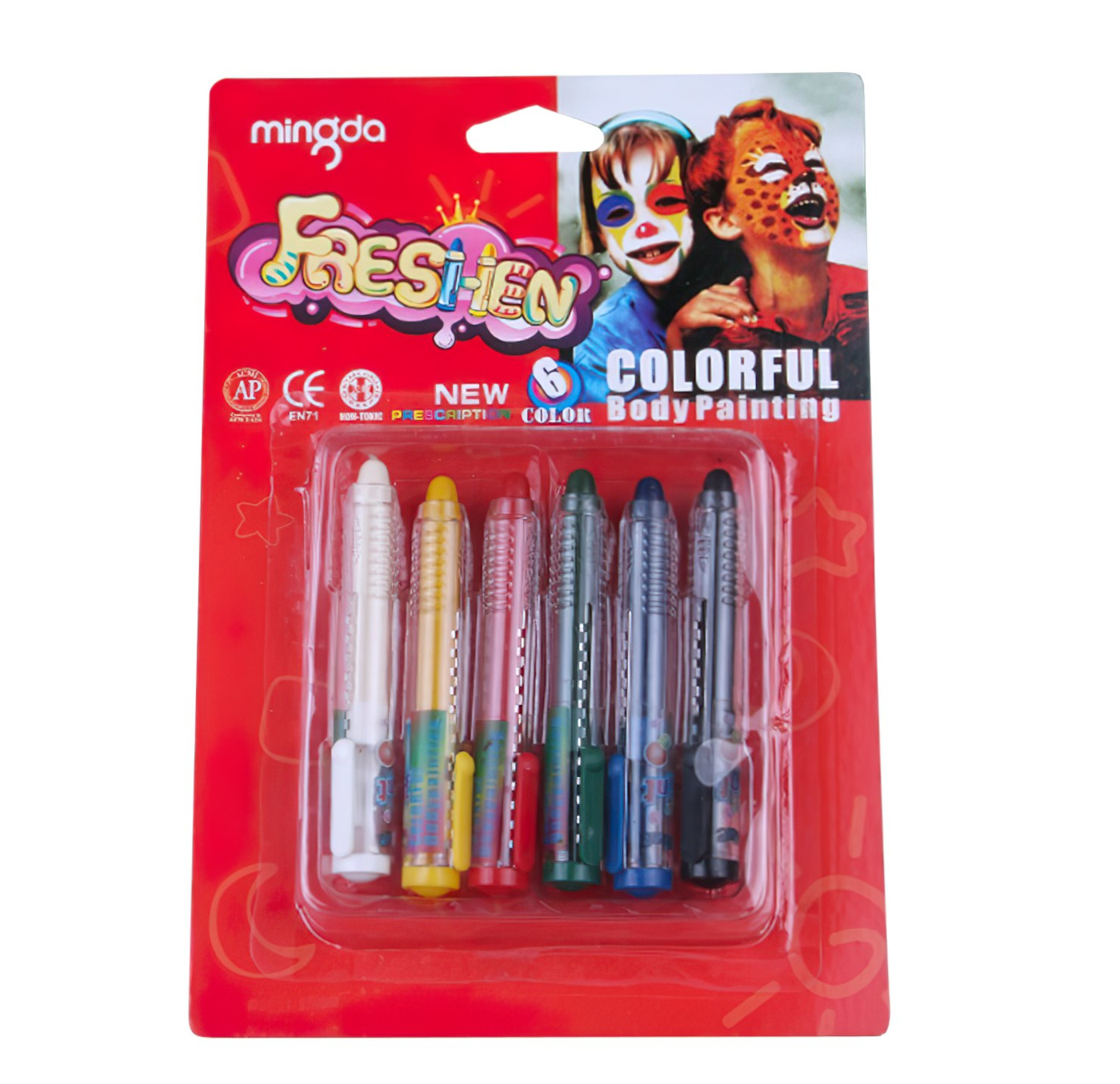 Dětská sada barev na obličej v tužce obsahuje 6 základních barev – bílou, žlutou, červenou, zelenou, modrou a černou. Praktické provedení v podobě výsuvných tužek zajišťuje snadnou a čistou aplikaci přímo na obličej nebo tělo, bez potřeby štětců či houbiček.