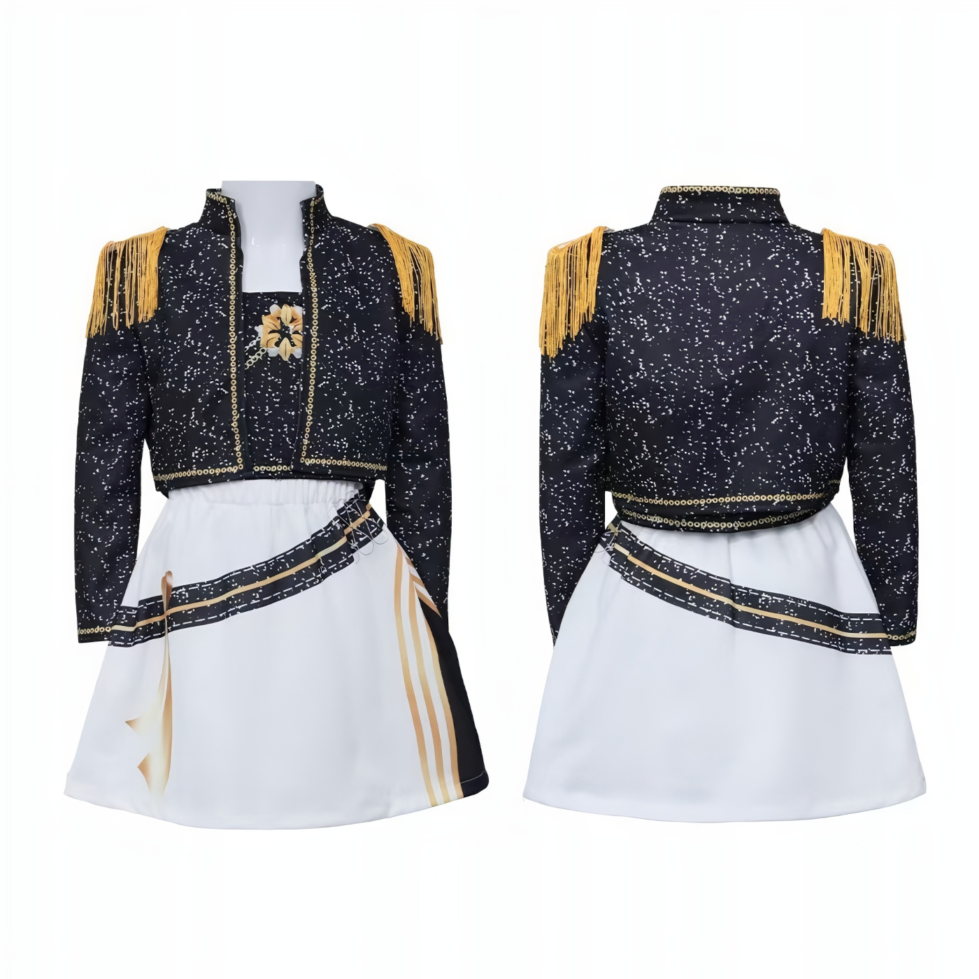 Kostým je vhodný na karnevaly, tematické oslavy, cosplay i vystoupení a díky elegantní kombinaci černé, bílé a zlatých detailů promění každou malou slečnu v sebevědomou K-pop hvězdu.