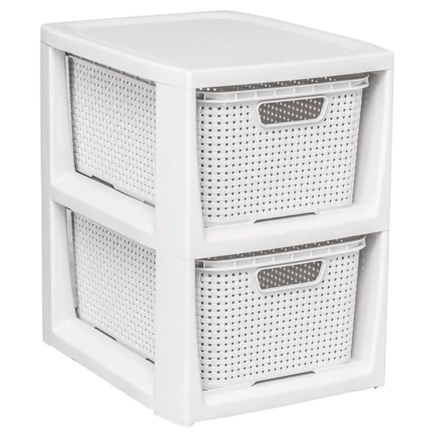 Plastová komoda Rattan je velmi dobré řešení pro uskladnění v malých prostorách. Je vyrobena z kvalitního plastu (bez ftalátů) a je ideální pro místnosti jako koupelna, šatna, dětský pokoj nebo domácí kancelář. Rozměr stojanu: 33,2 x 24 x 29,5 cm. Dva vyjímatelné košíky o rozměrech 13 x 19 x 28,3 cm