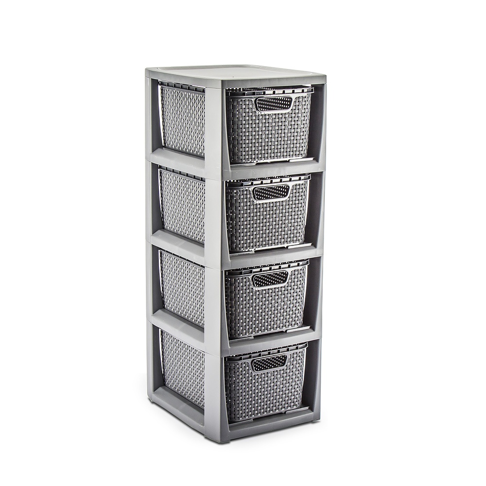 Plastová komoda Rattan je velmi dobré řešení pro uskladnění v malých prostorách. Vyrobeno z kvalitního plastu (bez ftalátů) je ideální pro místnosti jako koupelna, šatna, dětský pokoj nebo domácí kancelář . Rozměr stojanu: 64,3 x 24 x 29,5 cm , čtyři vyjímatelné košíky. Rozměr koše – 13 x 19 x 28,3 cm. Elegantní barevné provedení v antracitové barvě