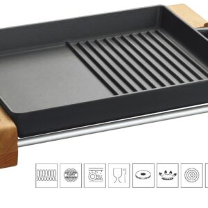 Litinová grilovací plotýnka s rozměry 26×32 cm a výškou 4 cm je univerzální pomocník pro Vaše grilování, smažení i pečení. Lze použít venku na všechny typy grilů, ale i doma na sporáku nebo v troubě. Litina se rovnoměrně prohřívá po celé ploše, dobře akumuluje teplo a zelenina i steaky se propečou přesně podle Vašich potřeb. Poté plotýnku jednoduše stáhněte z ohně a klidně i s jídlem servírujte na stůl na stylovém dřevěném podstavci.