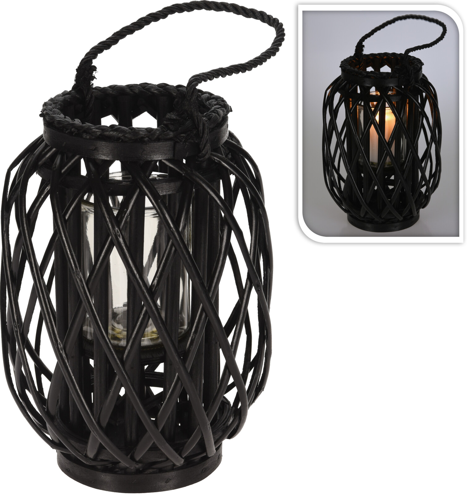 Lucerna Willow je černá proutěná lucerna doplněná uchem z provazu a skleněnou nádobou. Dokonale dotvoří večerní atmosféru.