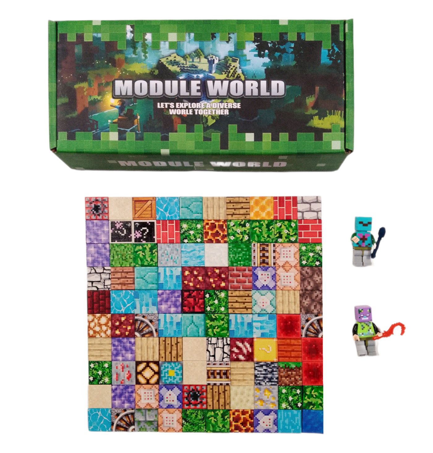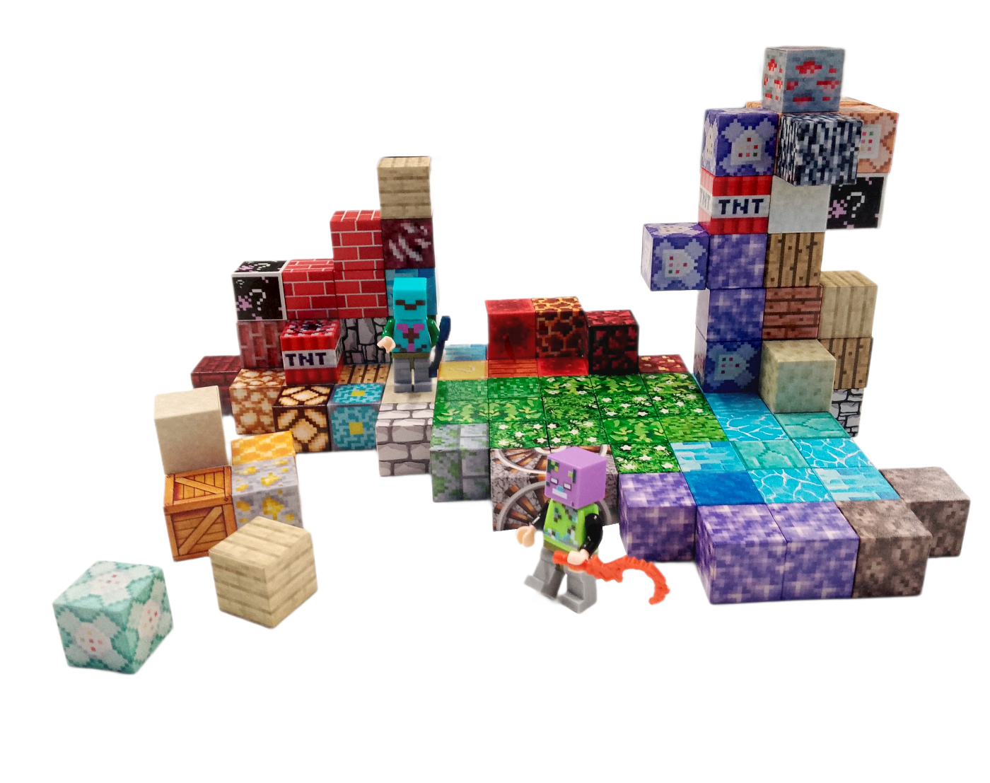 Bloky jsou vyrobeny z plastu s hladkým povrchem a uvnitř ukrývají bezpečné magnety. Spojování je jednoduché, pevné a přitom snadno rozebíratelné, což dětem umožňuje neomezené možnosti stavění. V sadě najdete cihly, TNT, trávu, lávu, dřevo, koleje a další známé herní prvky. Díky dvěma figurkám a široké škále motivů mohou děti vytvářet propracované herní scény, dobrodružné příběhy nebo celé krajiny. Figurky jsou pohyblivé a doplněné zbraněmi, které podněcují fantazii a akční hru.