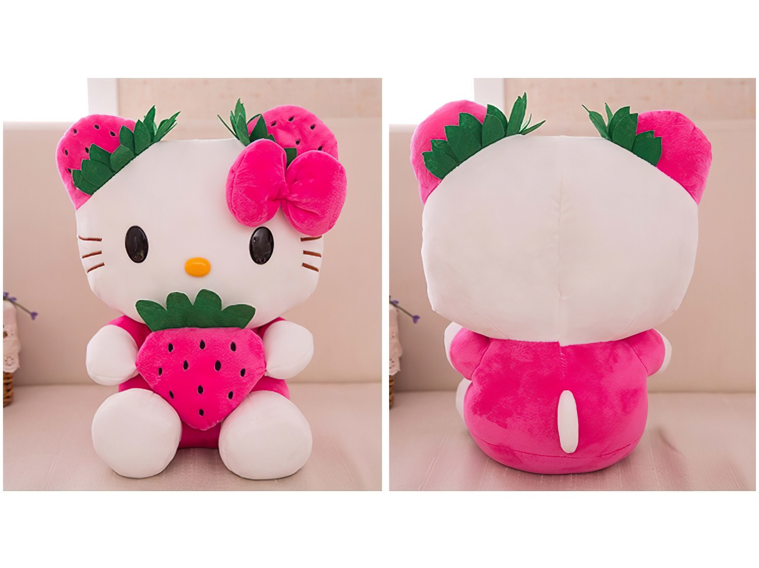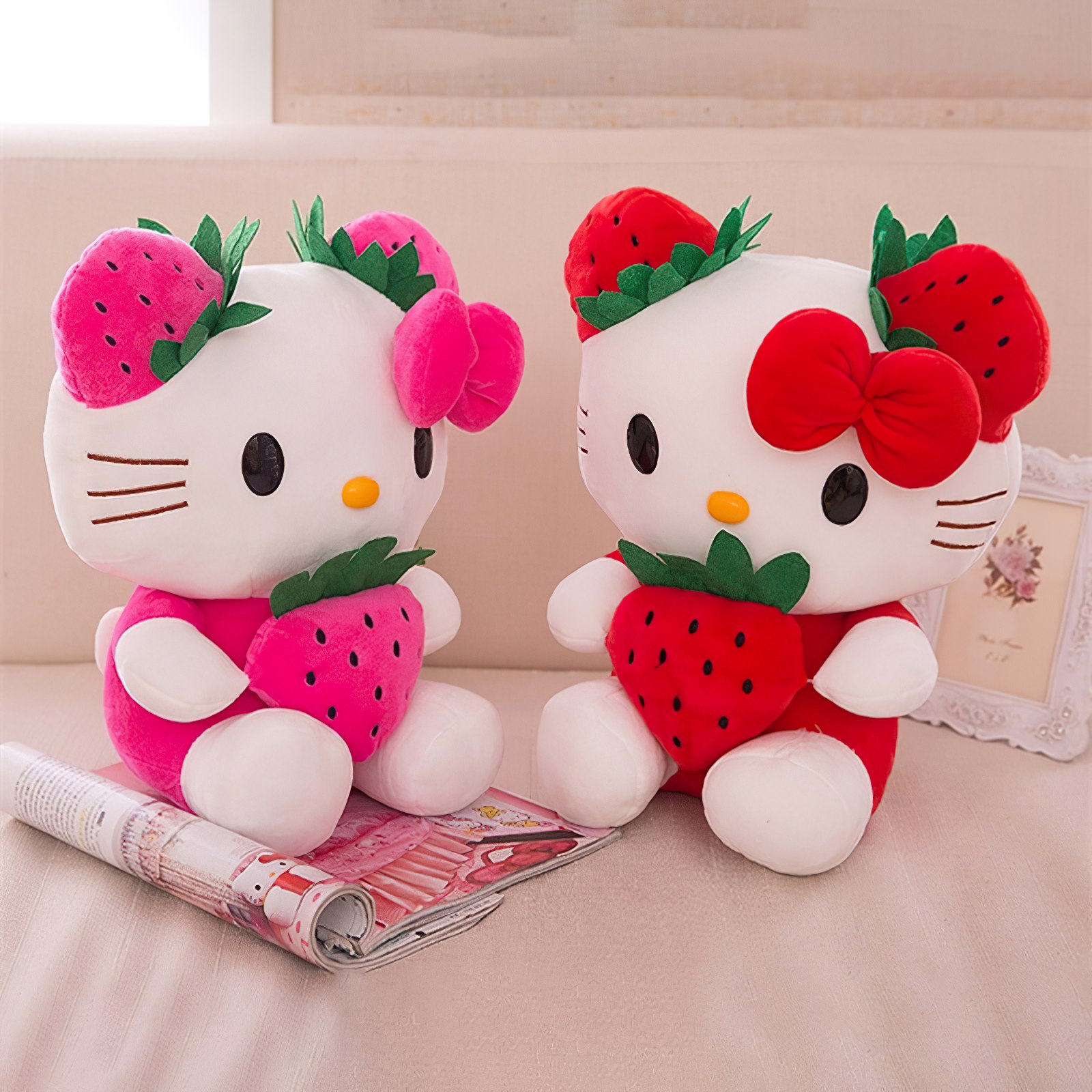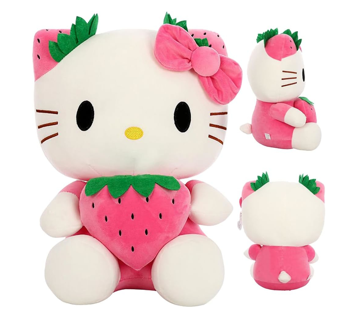 Roztomilá plyšová hračka Hello Kitty s jahůdkou o výšce 22 cm je ideálním dárkem pro malé i velké fanoušky této ikonické postavičky. Hello Kitty je oblečená do růžových šatiček a drží v náručí výraznou jahodu, která dodává hračce hravý a veselý vzhled. Typickou mašli má na hlavě, tentokrát v jahodovém stylu, což celkový dojem ještě víc roztomilostně podtrhuje.