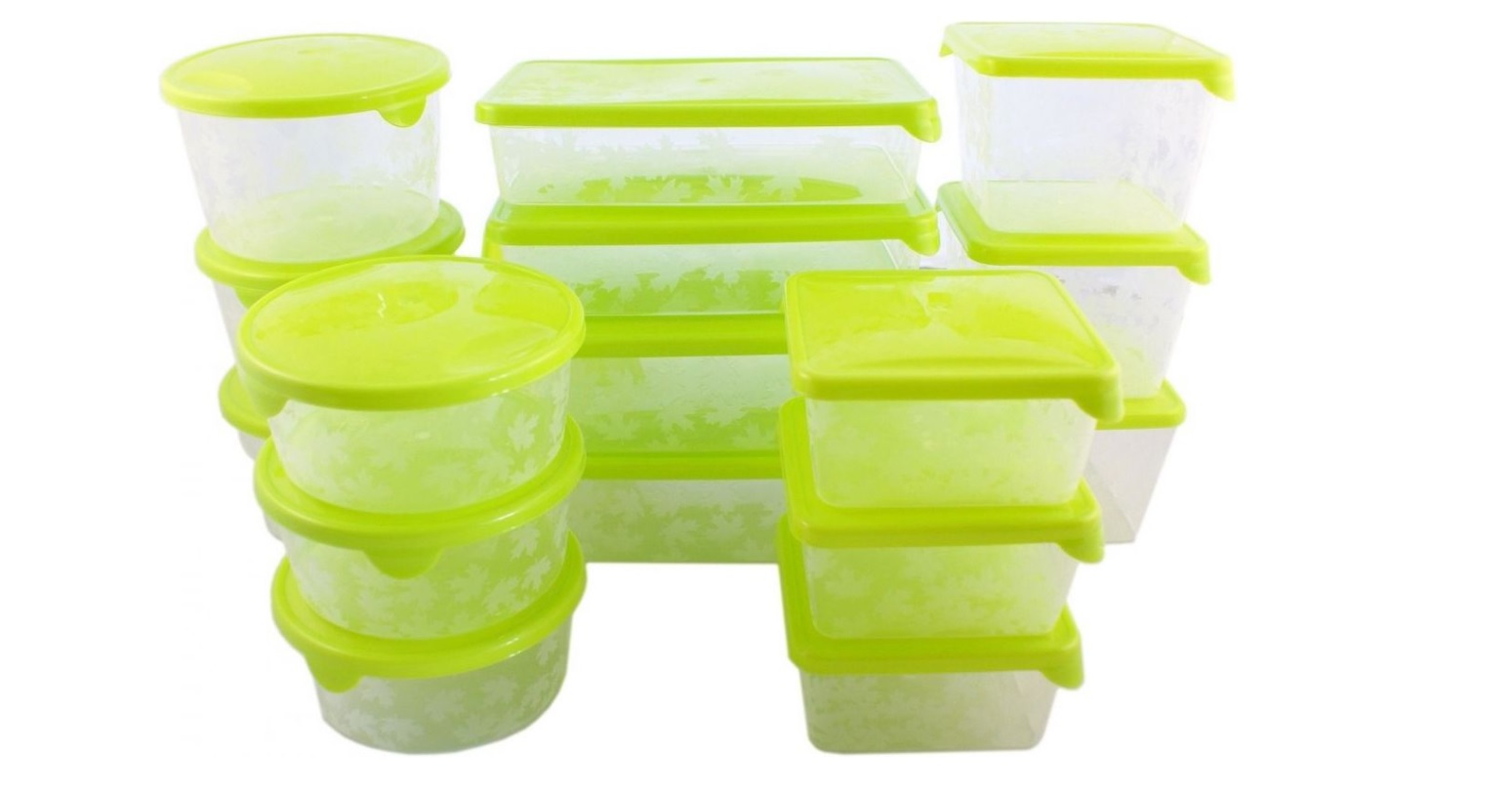 Sada víceúčelových dóz na potraviny s barevným víčkem. Svěží moderní design s motivem lístků. Kombinace dóz – 4x obdelník, 6x kulatá, 7x čtverec. Vhodné do mrazničky, mikrovlnné trouby (bez víčka). (4×0,45l + 3×0,75 l + 2×0,9l + 2×1,35l + 3×0,45l + 3×0,75l ). Barva – zelená