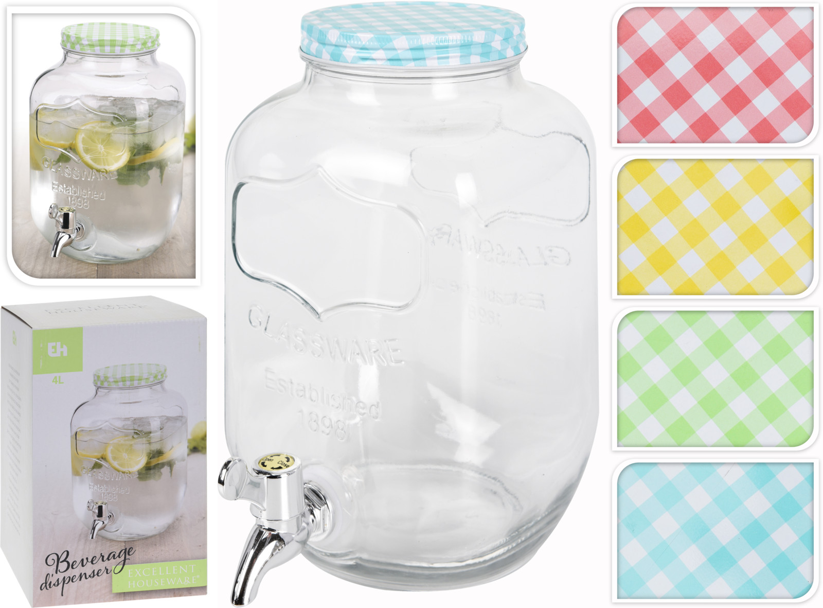Skleněný zásobník na nápoje pro servírování osvěžujících nápojů. Zásobník s ventilem je vyroben z kvalitního skla s praktickým kohoutkem. Široké hrdlo umožňuje pohodlně vkládat led nebo kousky ovoce. Výběr barvy je náhodný.