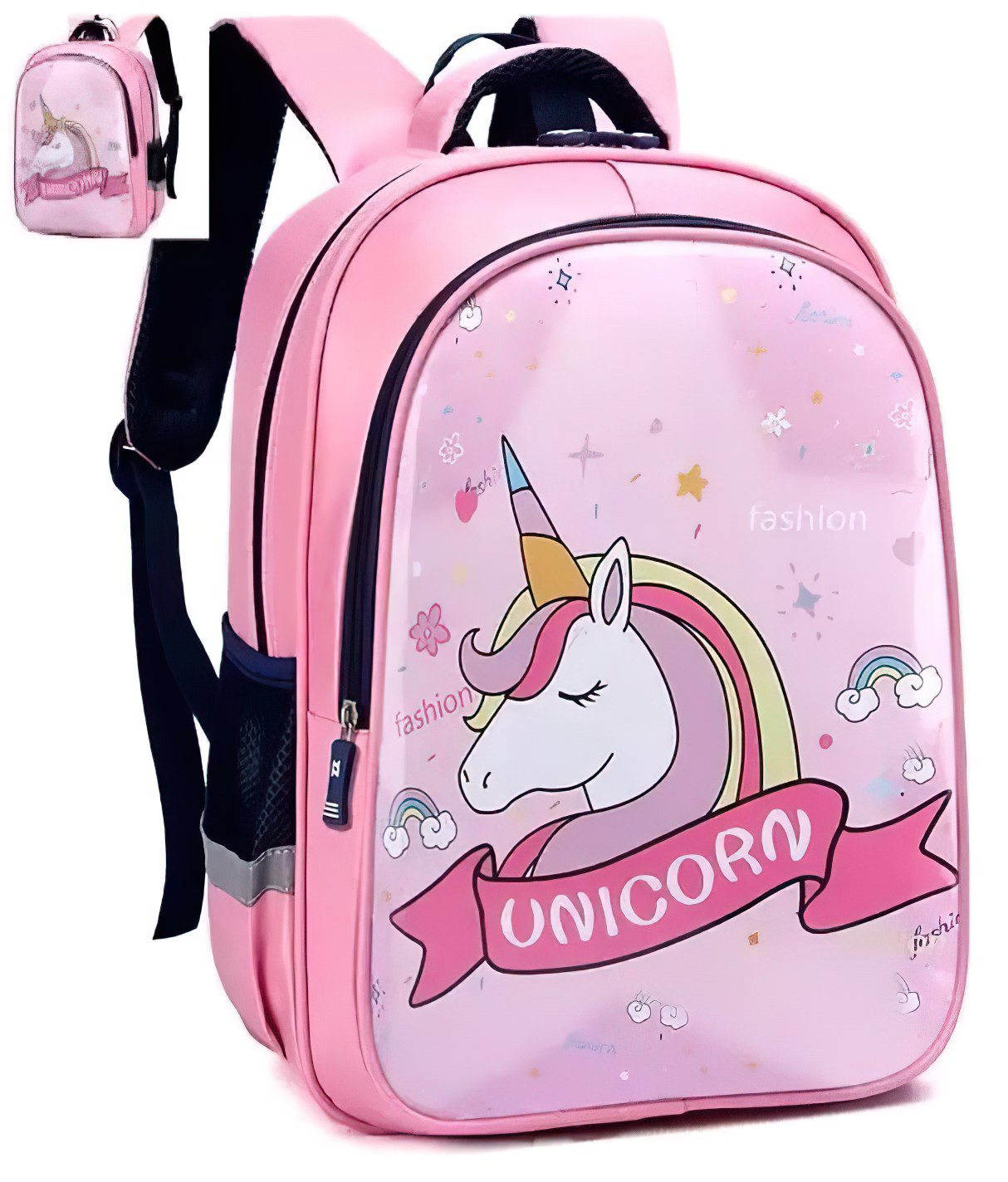 Školní dětský batoh v růžovém provedení s motivem Jednorožce. Funkční pohodlný batoh obsahuje dvě vnitřní přihrádky na zip, po bocích dvě síťované kapsy na láhev s pitím.  Díky vyztuženým, profilovaným zádům a polstrovaných nastavitelných ramenních popruhů je nošení batohu velmi pohodlné. Batoh je vyroben z odolného materiálu.