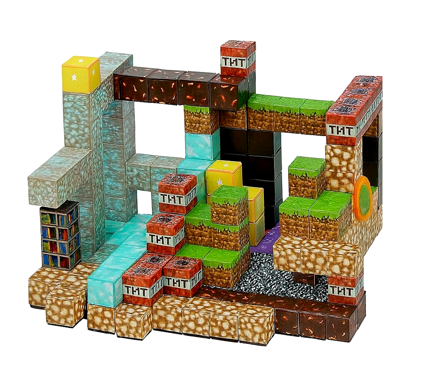 Stavebnice obsahuje 220 dílků včetně magnetických bloků a dvou herních postaviček s doplňky. Najdete zde kostky jako diamant, železo, zlato, kámen, tráva, bedrock, knihovny a samozřejmě výbušné TNT. Díky pestré nabídce prvků lze postavit rozsáhlé stavby, důlní komplexy, pevnosti nebo akční scény s příšerami a hrdiny.