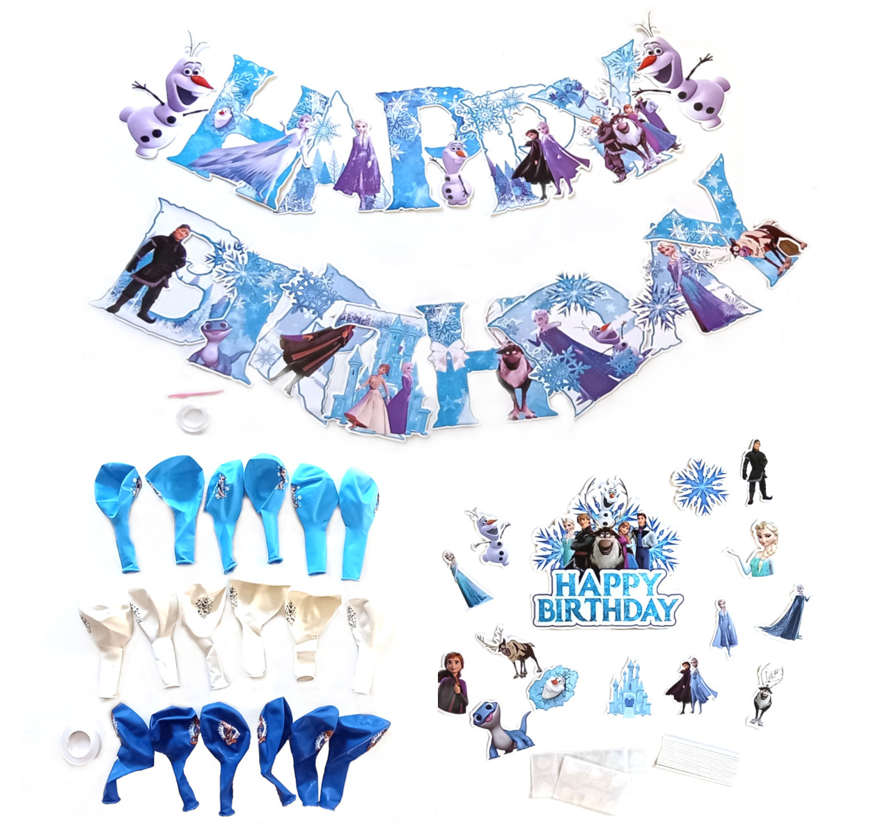Design inspirovaný postavami jako Elsa, Anna a Olaf přinese na oslavu kouzelnou atmosféru plnou sněhových vloček a zimní magie. Barevné provedení v odstínech modré a bílé krásně vynikne v každém interiéru.