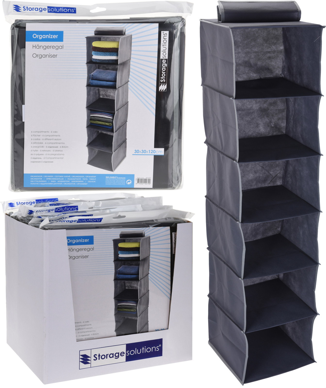 Praktický závěsný organizér / regál s 6  přihrádkami a poutkem na uchycení. Vhodný do šatníku, skříně, dětského pokojíčku nebo koupelny.  Kompaktní skládací provedení se zesílenými dnem každé police.